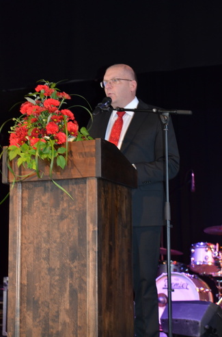 ![]() Teollisuusliiton puheenjohtaja Riku Aalto välitti juhlaväelle liiton tervehdyksen. |